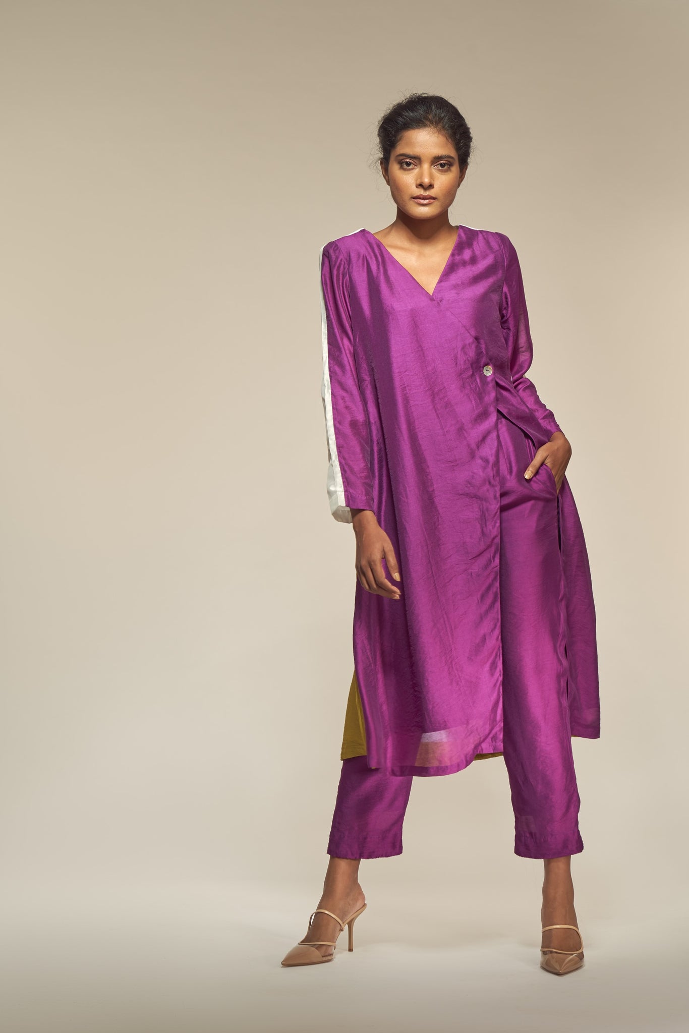 An overlap top held in place by hook, eye and shell buttons. While the front has a solid Aubergine color the back flaunts a thoughtful color block in white and yellow. Color Blocked full sleeves with light shoulder pads for a sculpted look. The top is lined.
