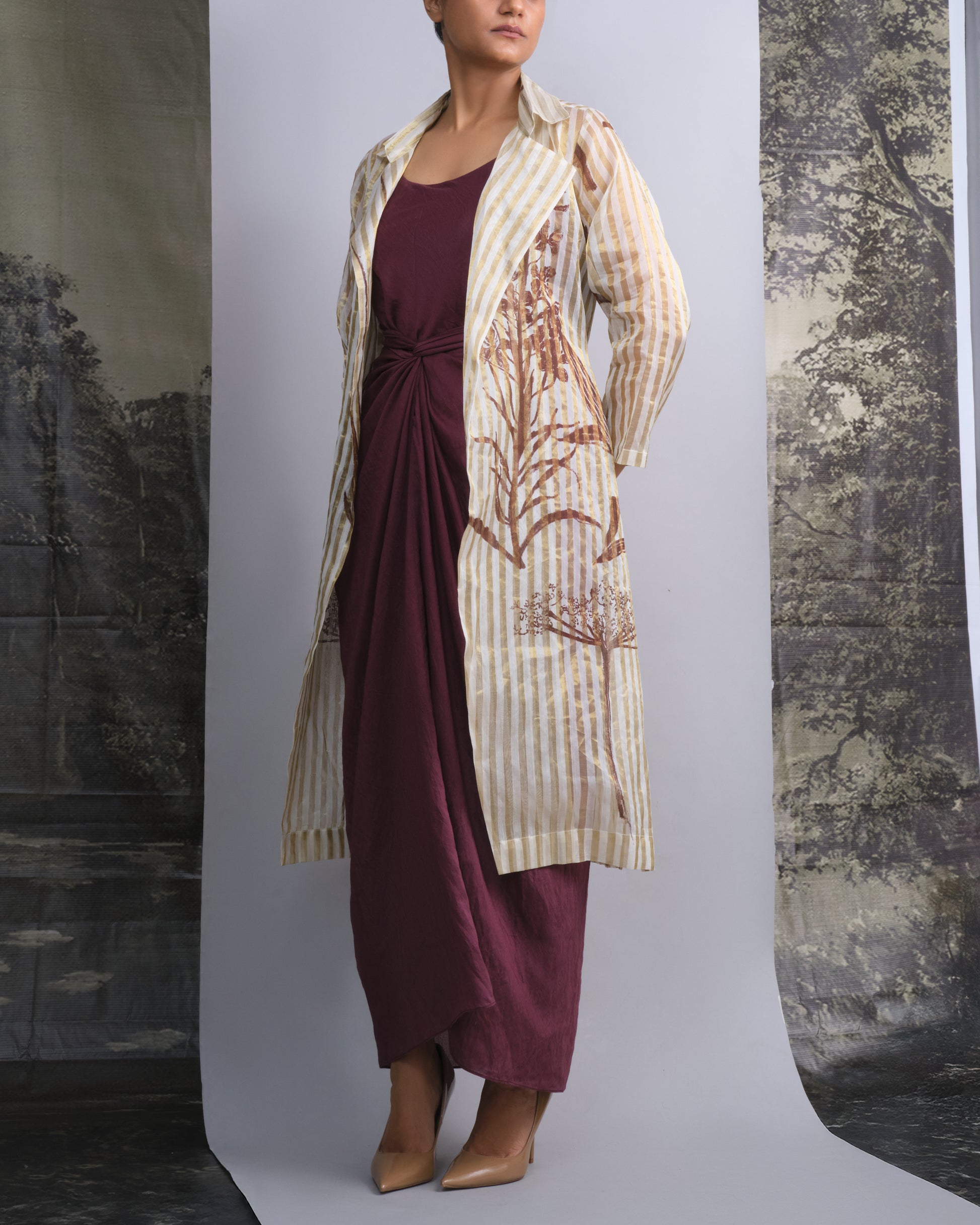 The rich wine hue adds depth to the simplicity of the silhouette, making it versatile for both festive and evening occasions. A timeless otouto piece — fluid, refined, and perfectly balanced between structure and softness.